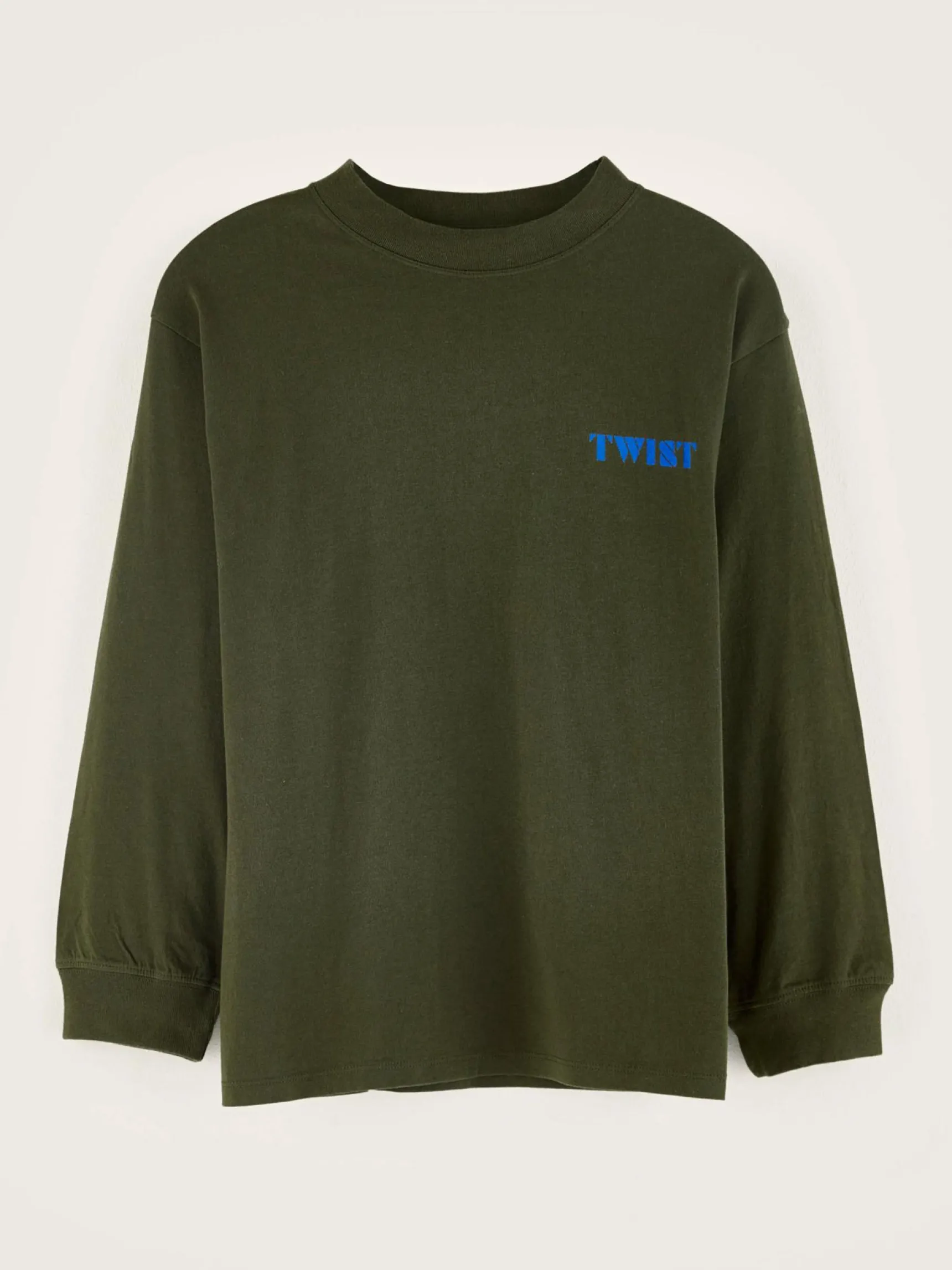 Comfortabel mosgroen T-shirt van geborstelde katoenjersey, met “Twist”-print op de borst.