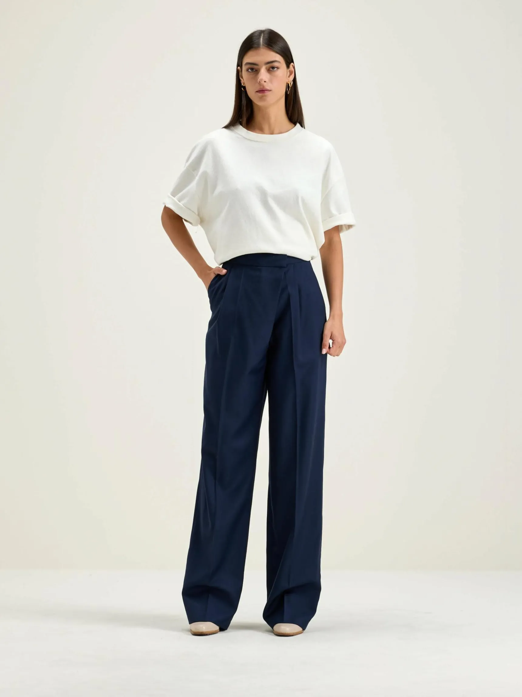 Elegante, high-waist broek van marineblauwe wol, met rechte pijpen en gedrapeerd gekruist voorpand.