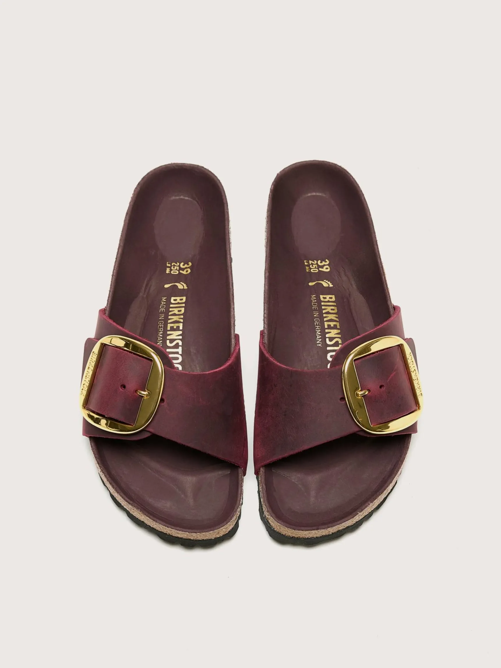 De Birkenstock Madrid Big Buckle sandalen hebben een grote metalen gesp, een zachte lederen voering en een dik bovenwerk van geolied nubuckleder met onafgewerkte randen.