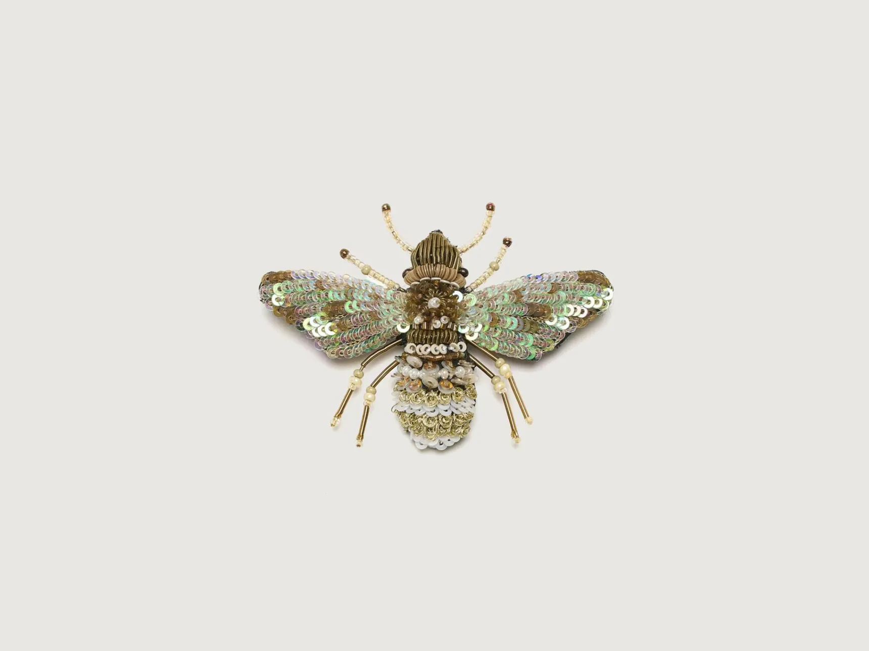 De Trovelore Pearl Bee Broche speld, met de hand geborduurd door Indiase ambachtslieden, is een prachtig draagbaar kunstwerk.
