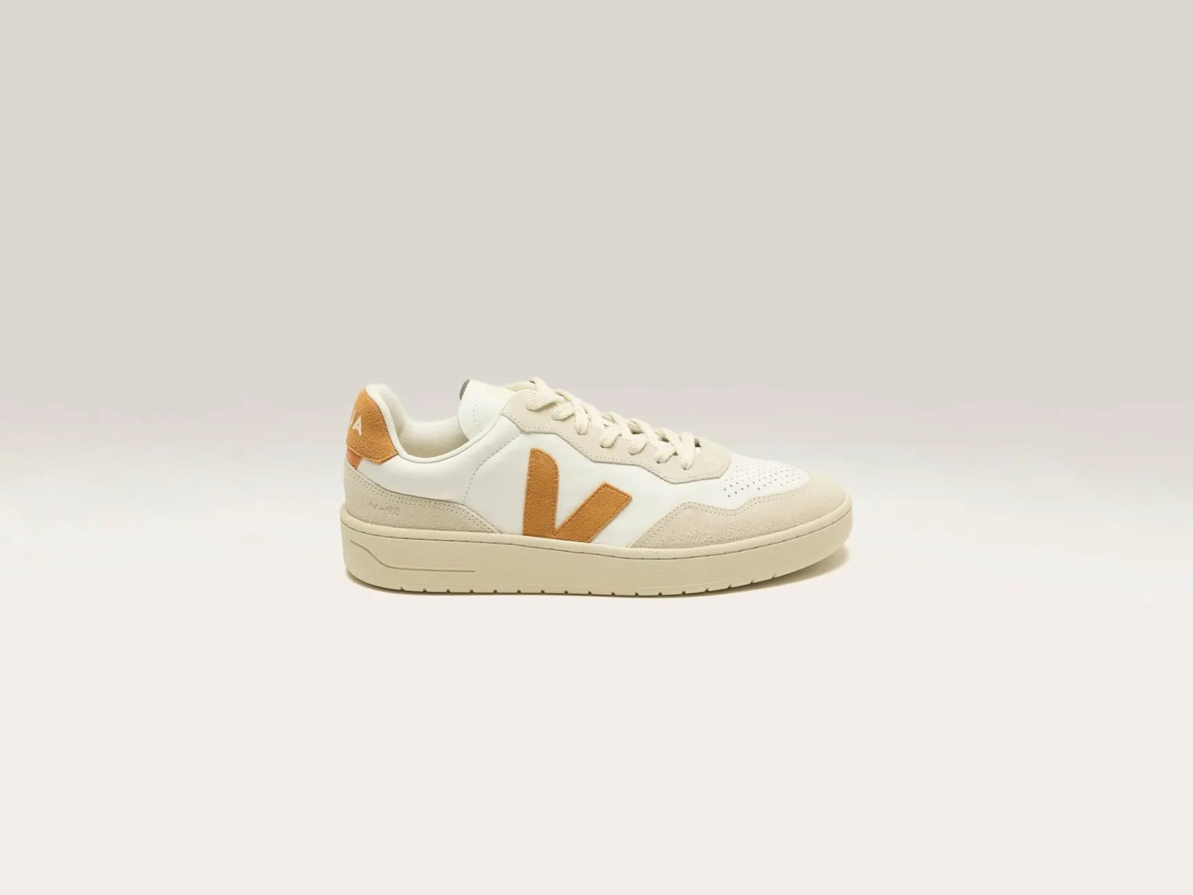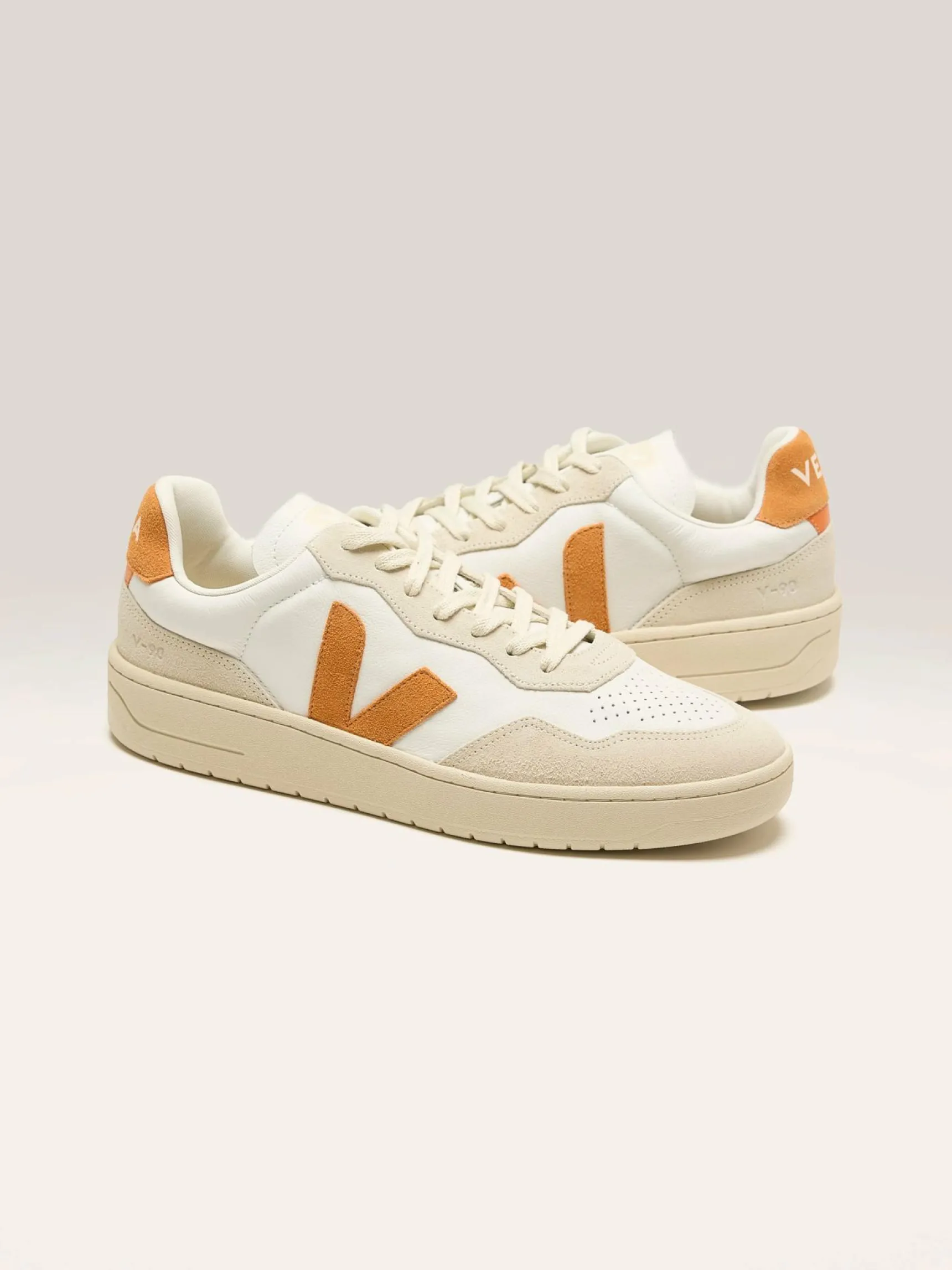 De Veja V-90 sneakers hebben een bovenwerk van Organic Traiced leder met iconische rubberen zolen uit Amazonië en milieuvriendelijke ontwerpelementen.