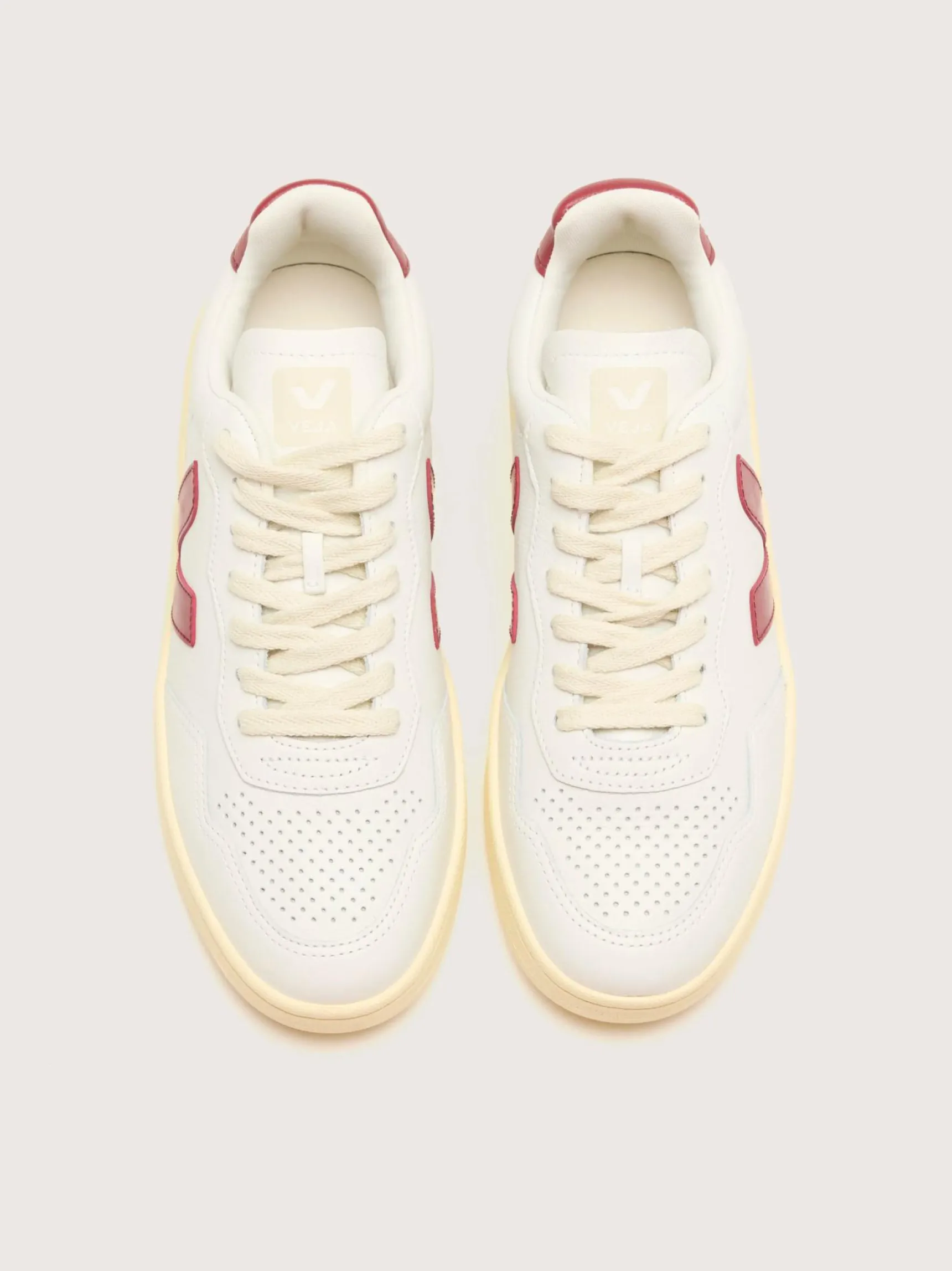 The Veja V-90 sneakers feature Organic Traced leather uppers with iconic Amazonian rubber outsoles and eco-friendly design elements.