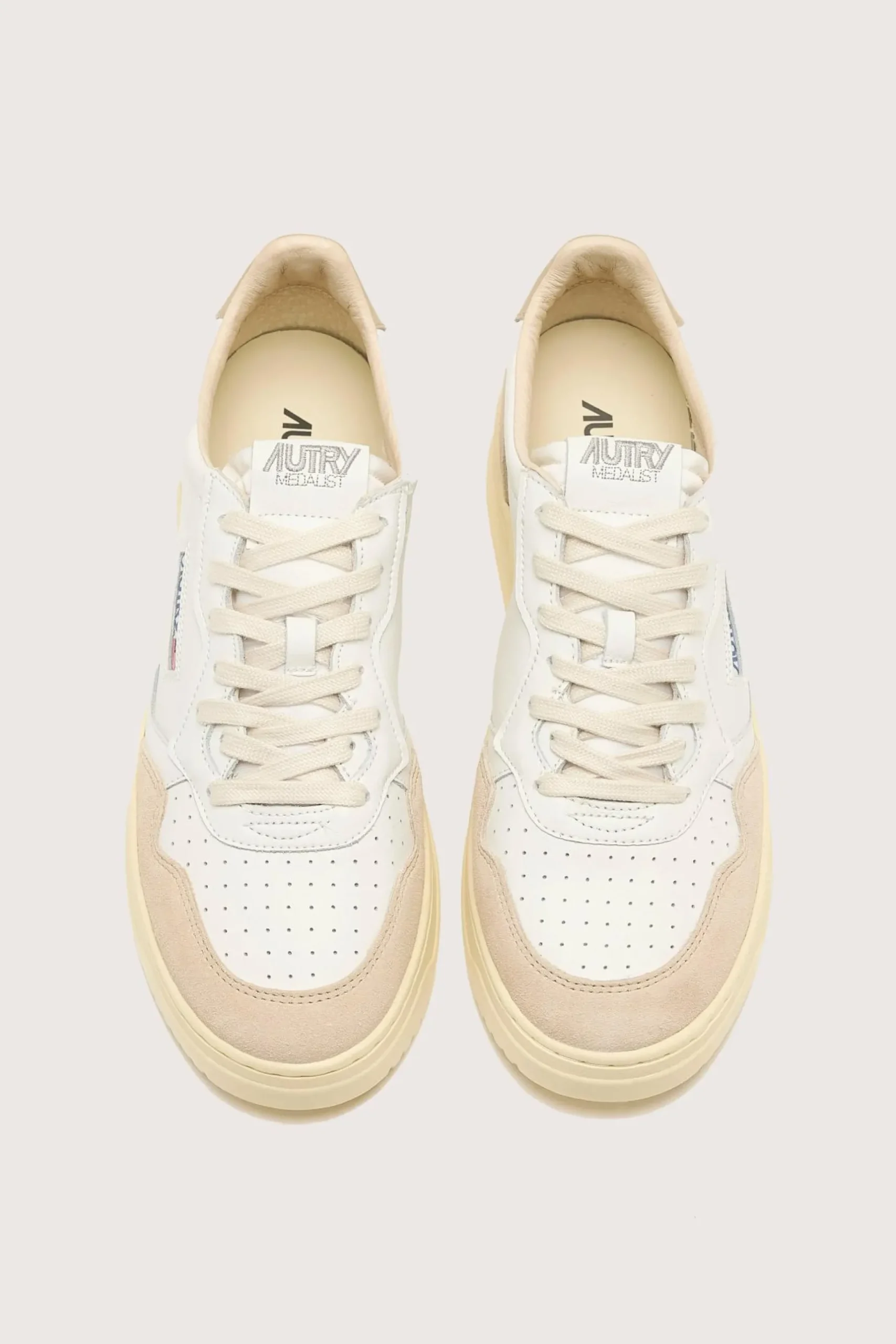 The Autry Medalist Low sneaker features a supple white leather upper, soft suede panels, and a perforated toe.