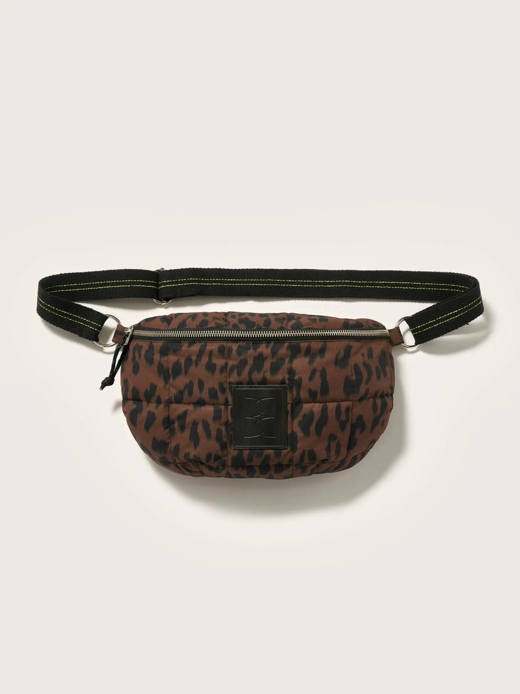 Heuptas met rits vooraan, van gewatteerde ripstop met luipaardprint.