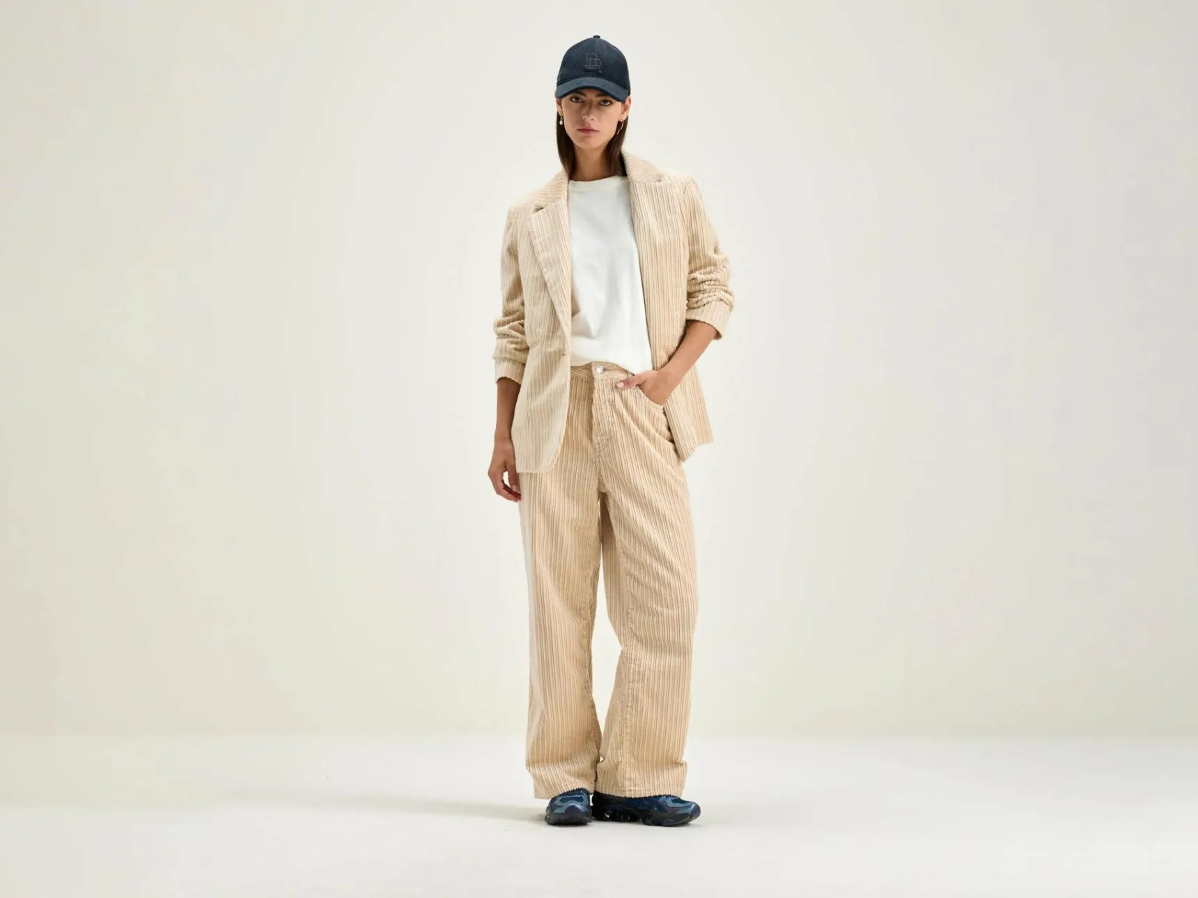 Mid-waist jeans met wijde pijpen, van ecru corduroy met brede rib en een gemarmerd effect.