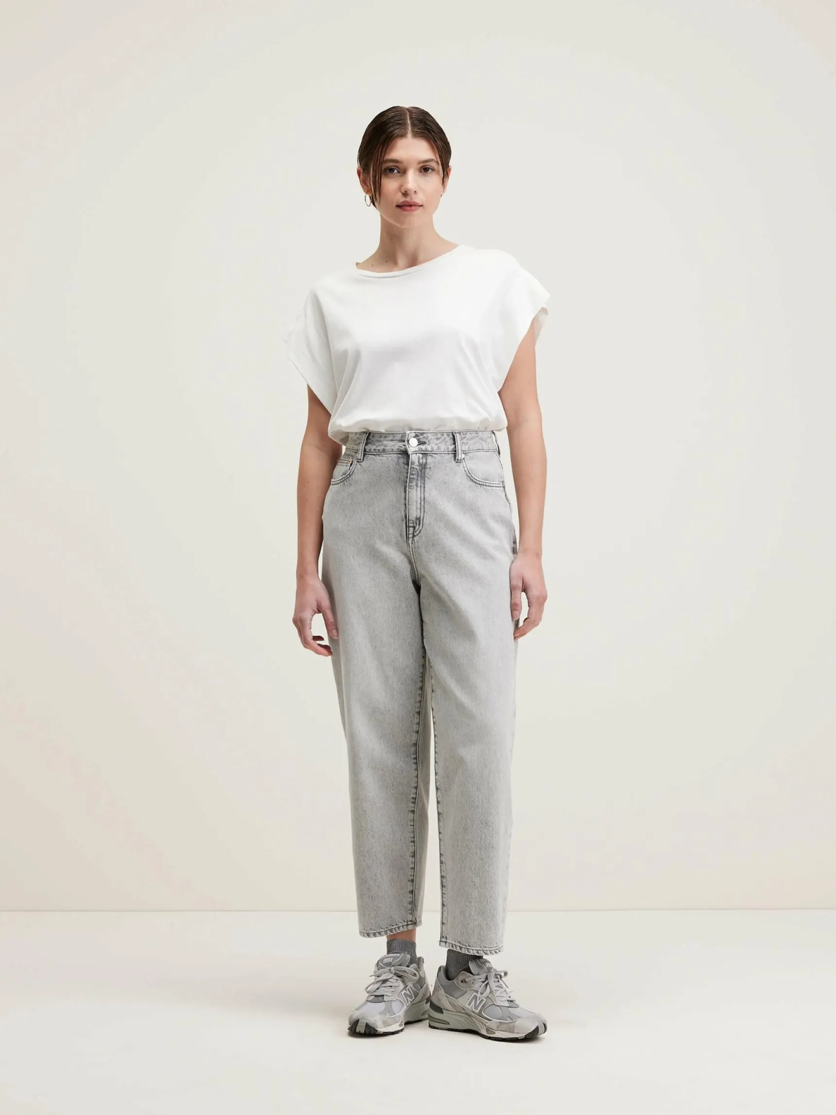 High-waist, mom jeans met pofpijpen van versleten grijs denim.