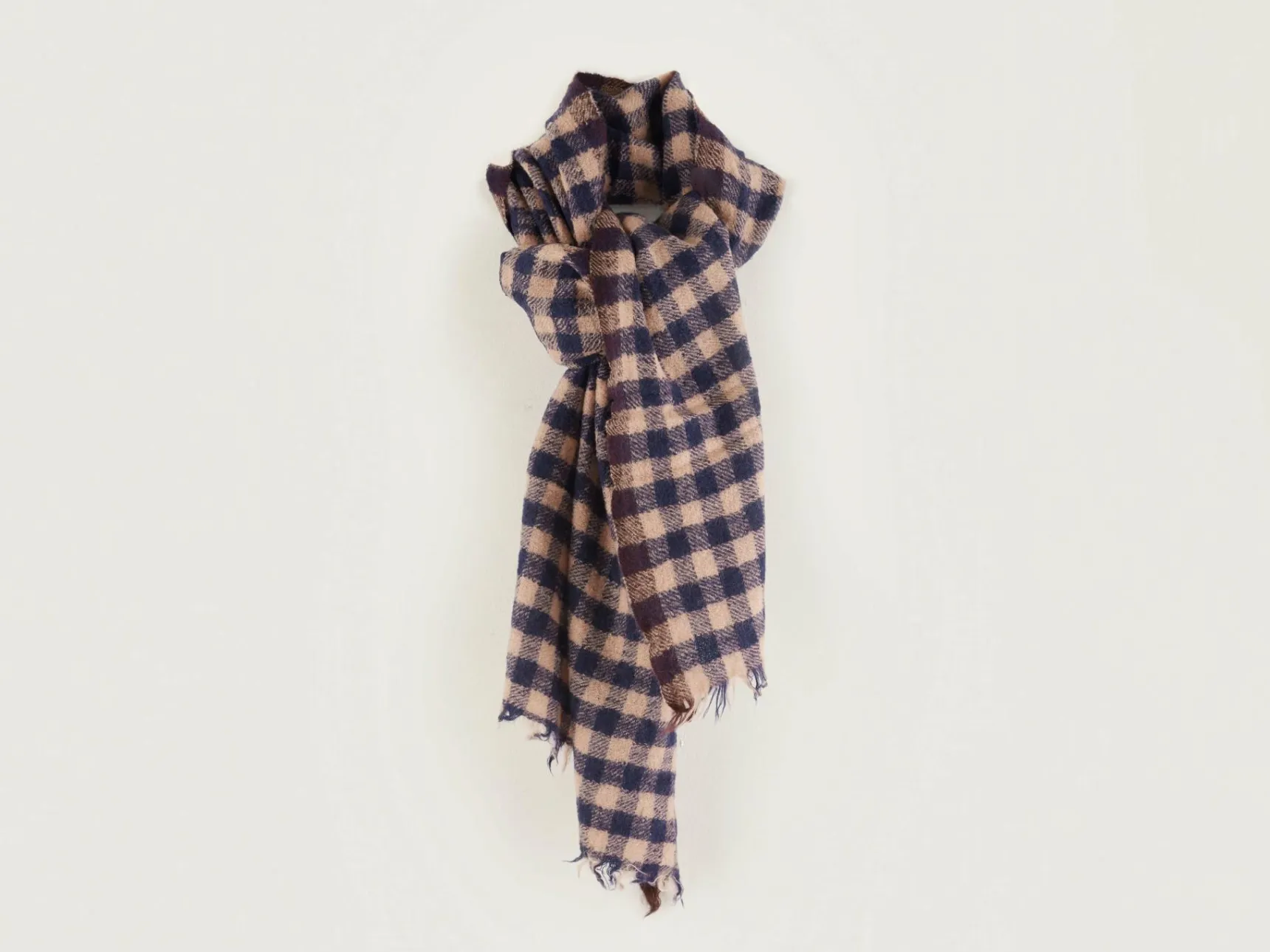 Geweven wollen sjaal met roze ruitjespatroon.