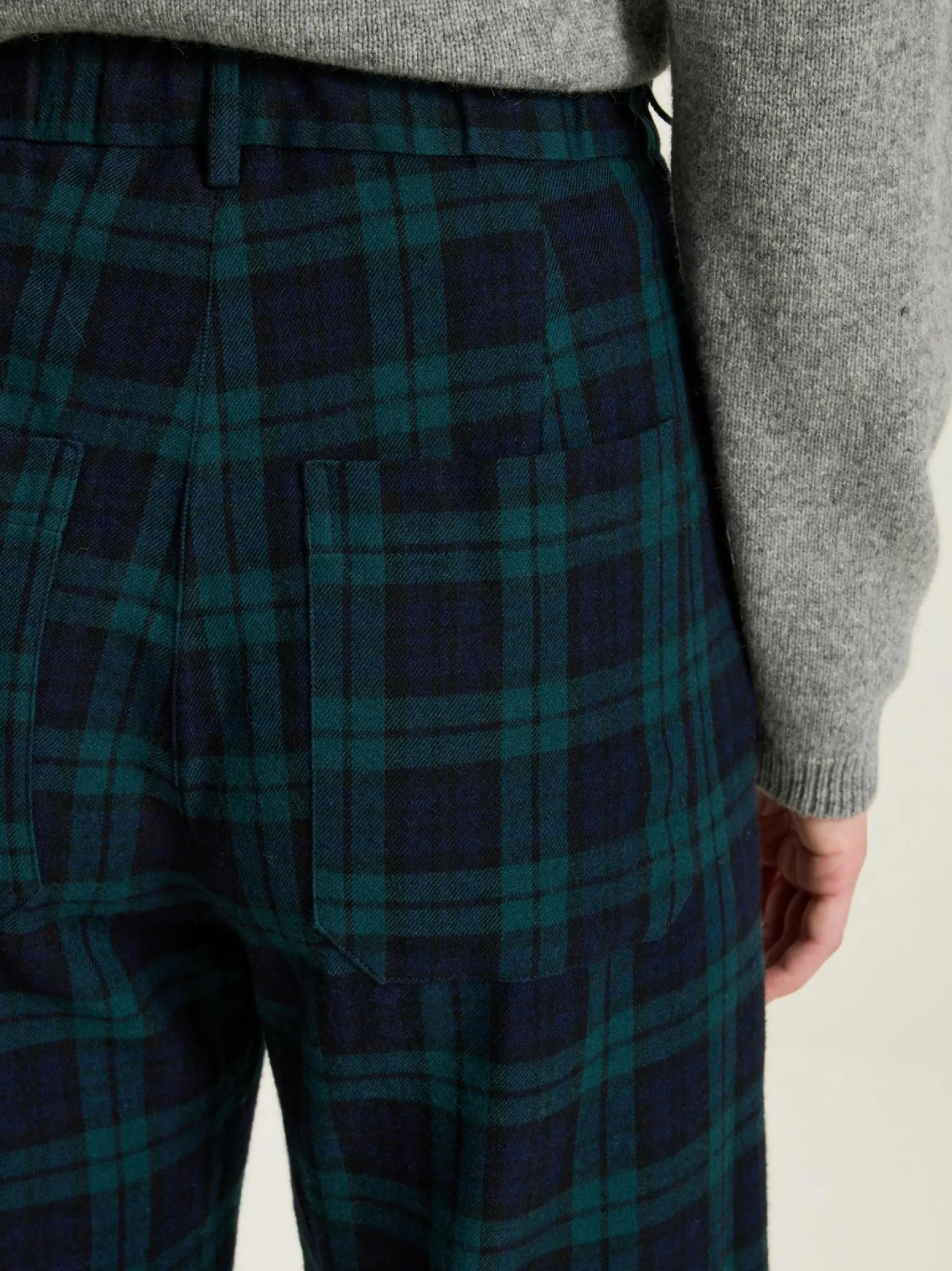 The Sarahwear Saxophonist pants, made from a wool-cotton blend, have a masculine silhouette with waist tucks and an elastic back waistband.