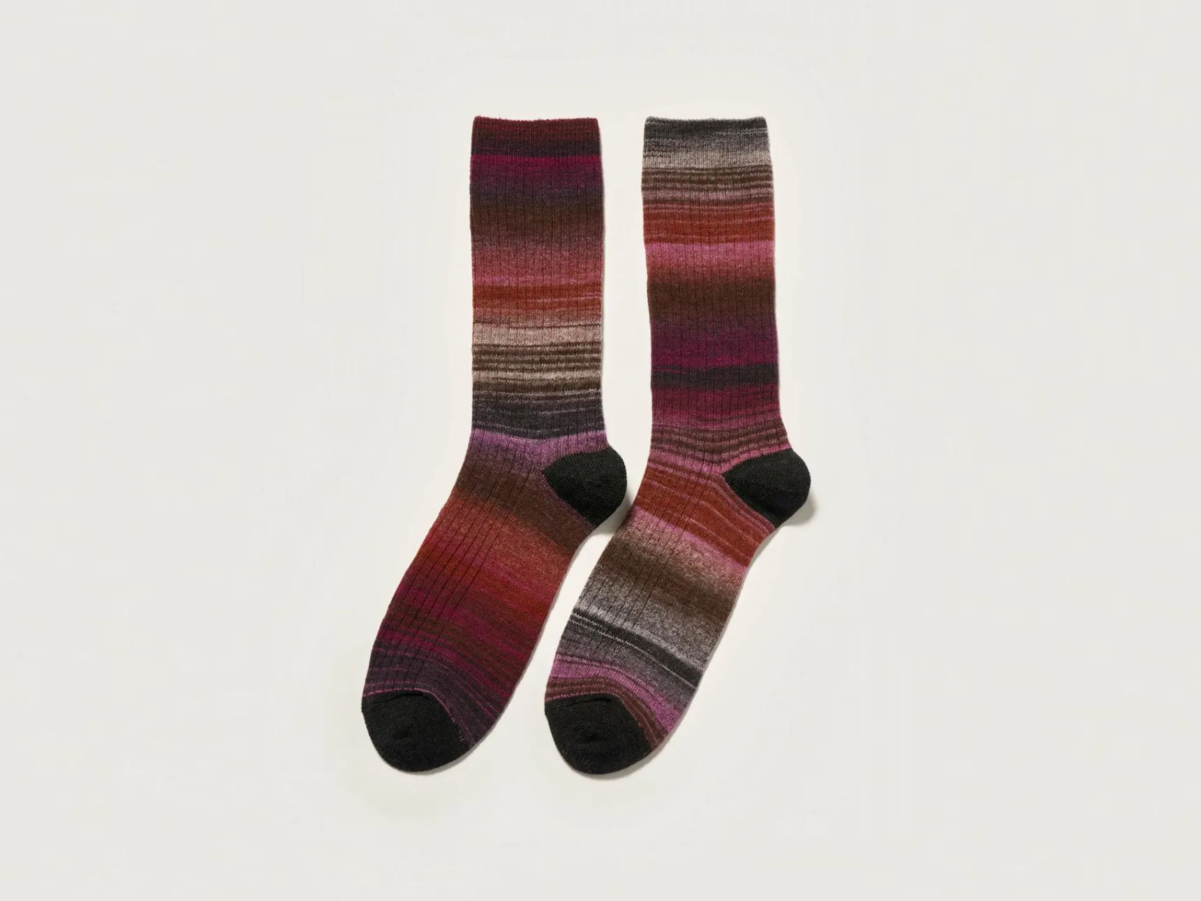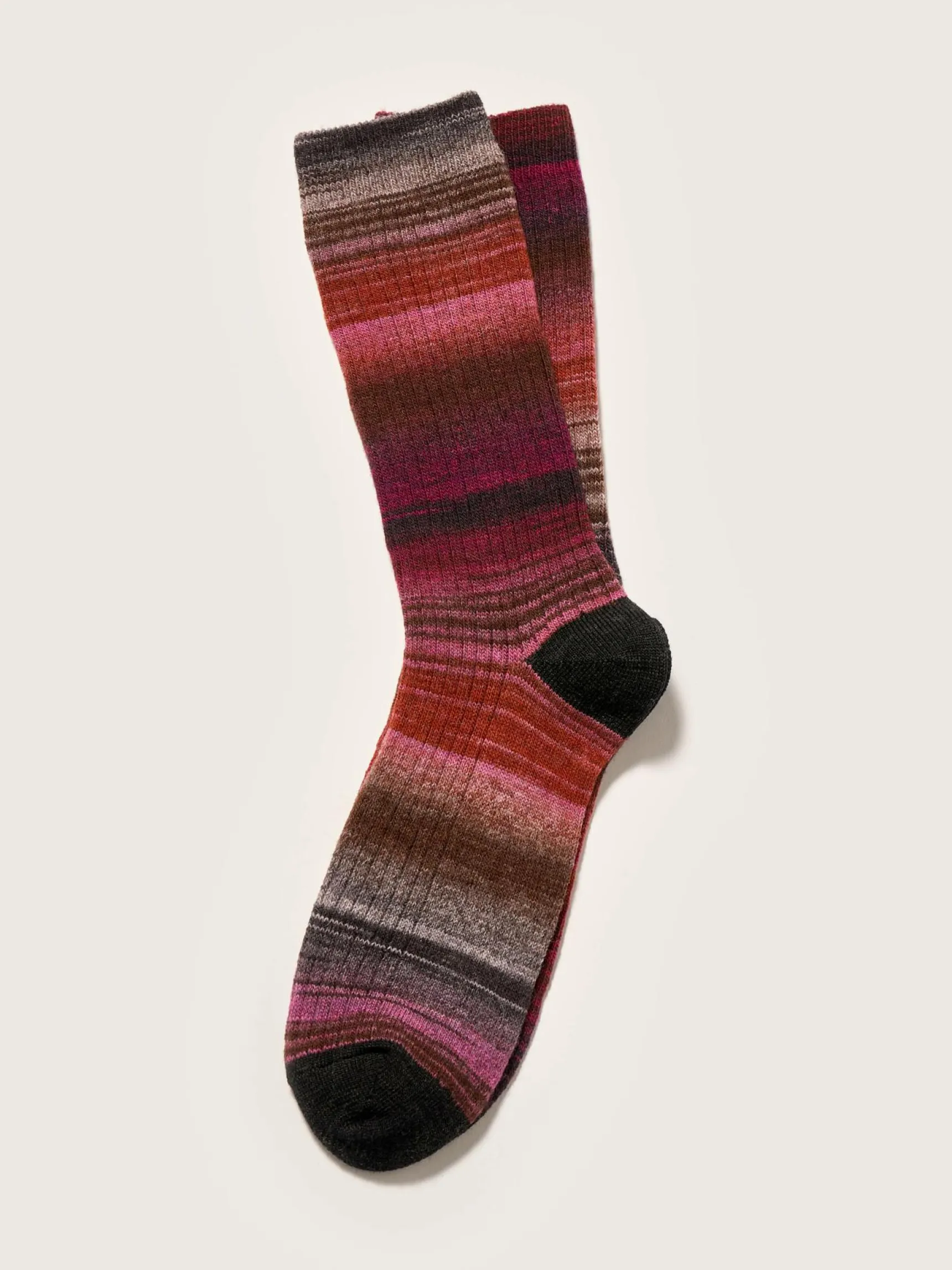 Ribgebreide sokken van meerkleurig garen, met schakeringen van roze en rode en contrasterende tenen en hielen.