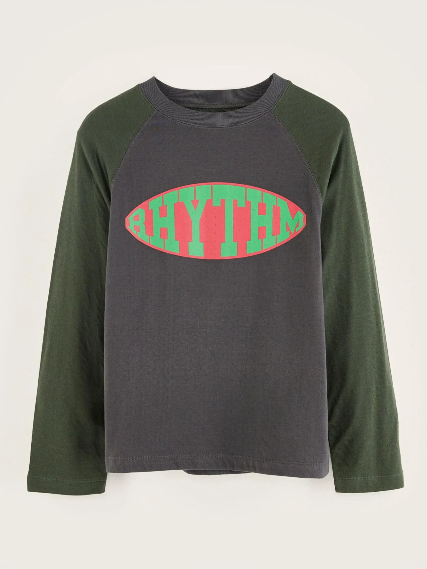 Recht T-shirt met raglanmouwen van tweezijdig donkerblauw kartoenjersey, met “Rhythm” print op de voorkant.