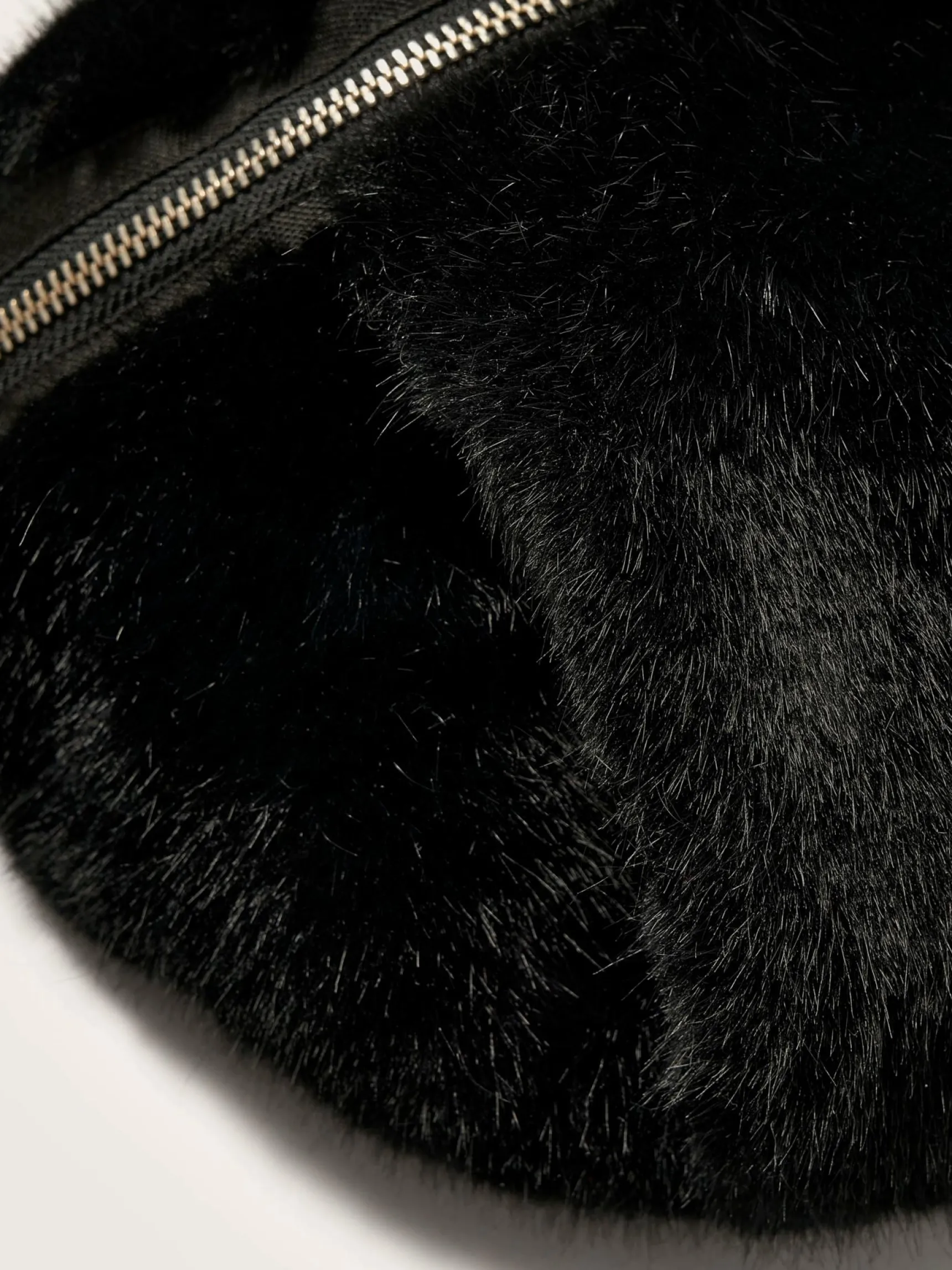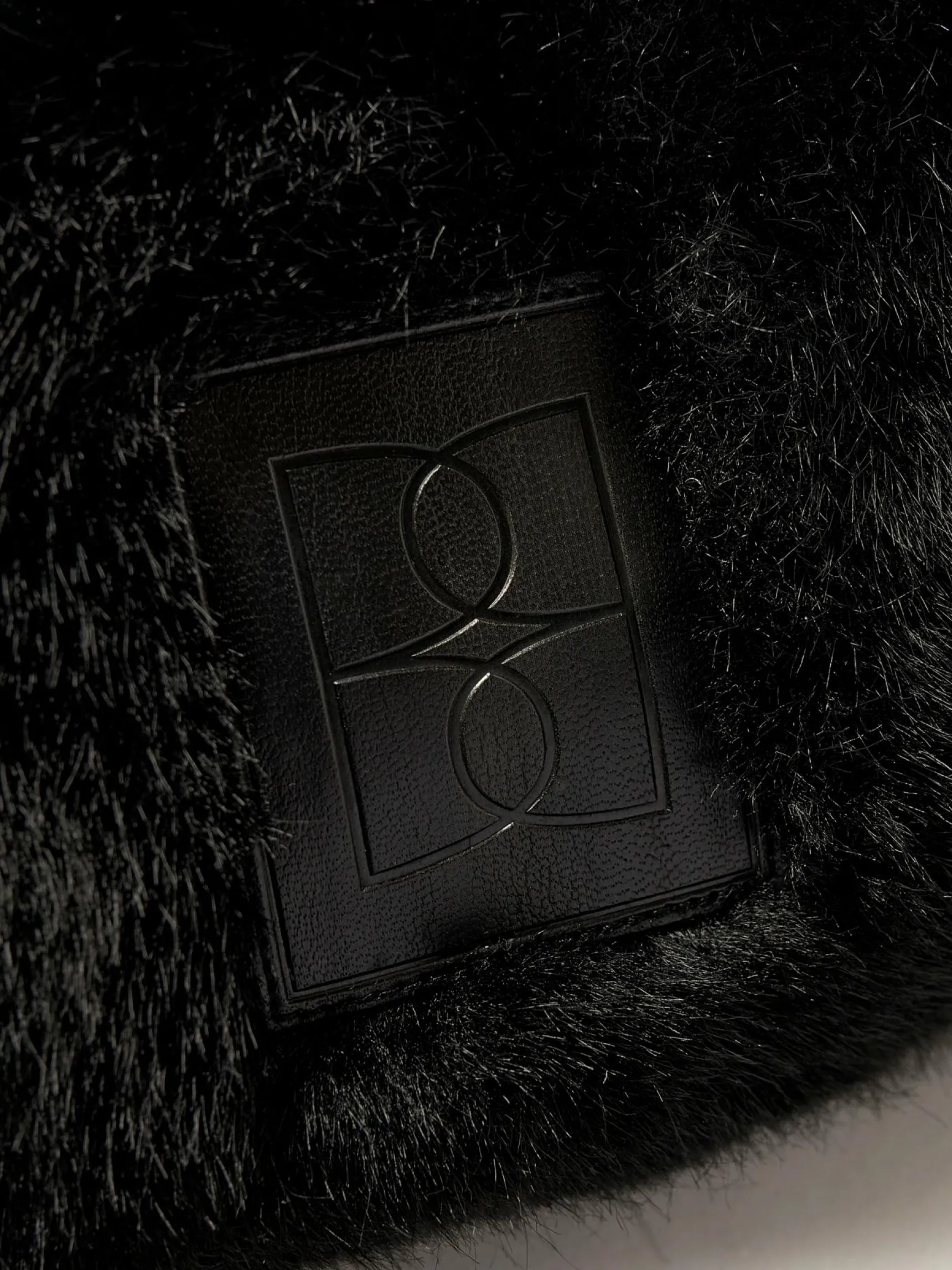 Moftas van zwart nepbont, met een Bellerose-label op de voorkant en ruimte om de handen te verwarmen.