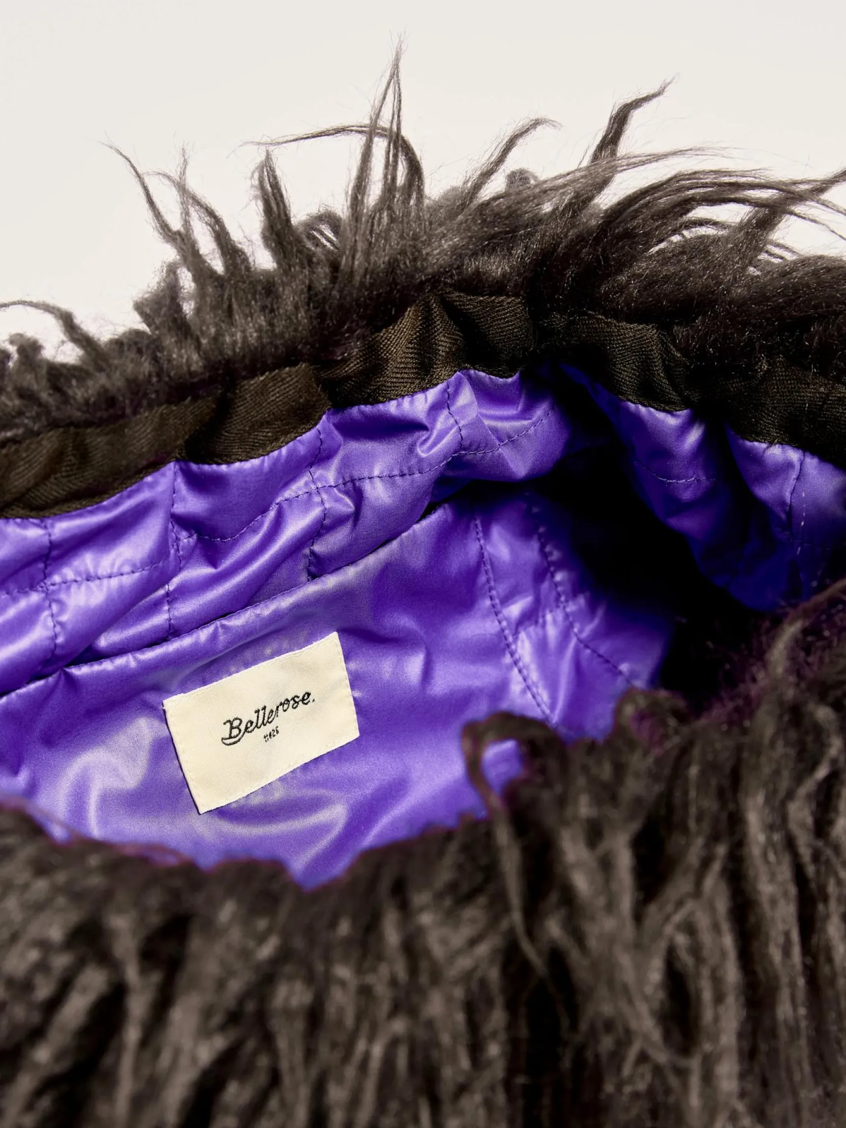 Clutch bag van nepbont dat een imitatie is van Mongoolse lamswol, gevoerd met gewatteerde paarse stof.