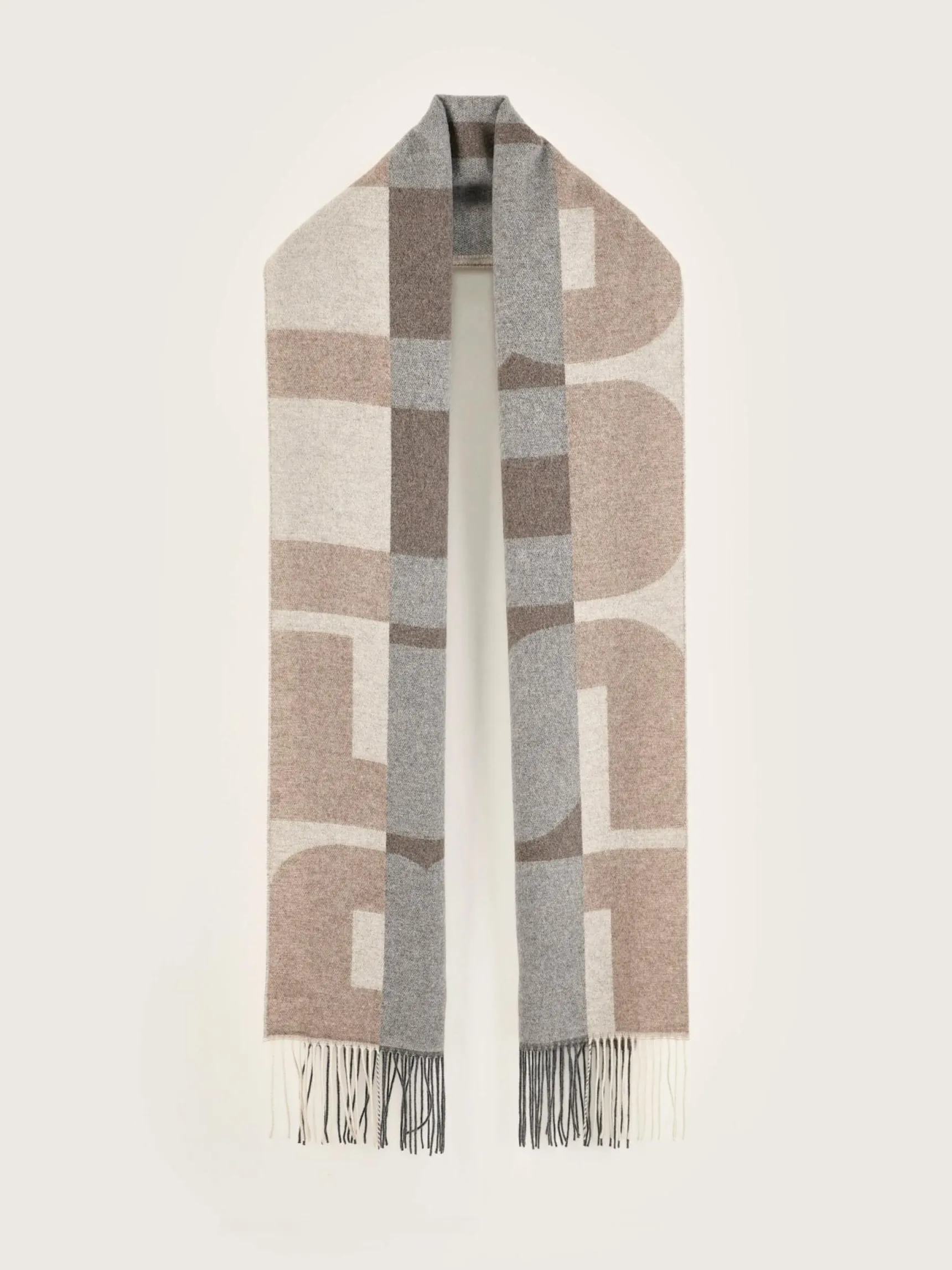 Geweven sjaal in neutrale tinten, met reusachtig groot logo.