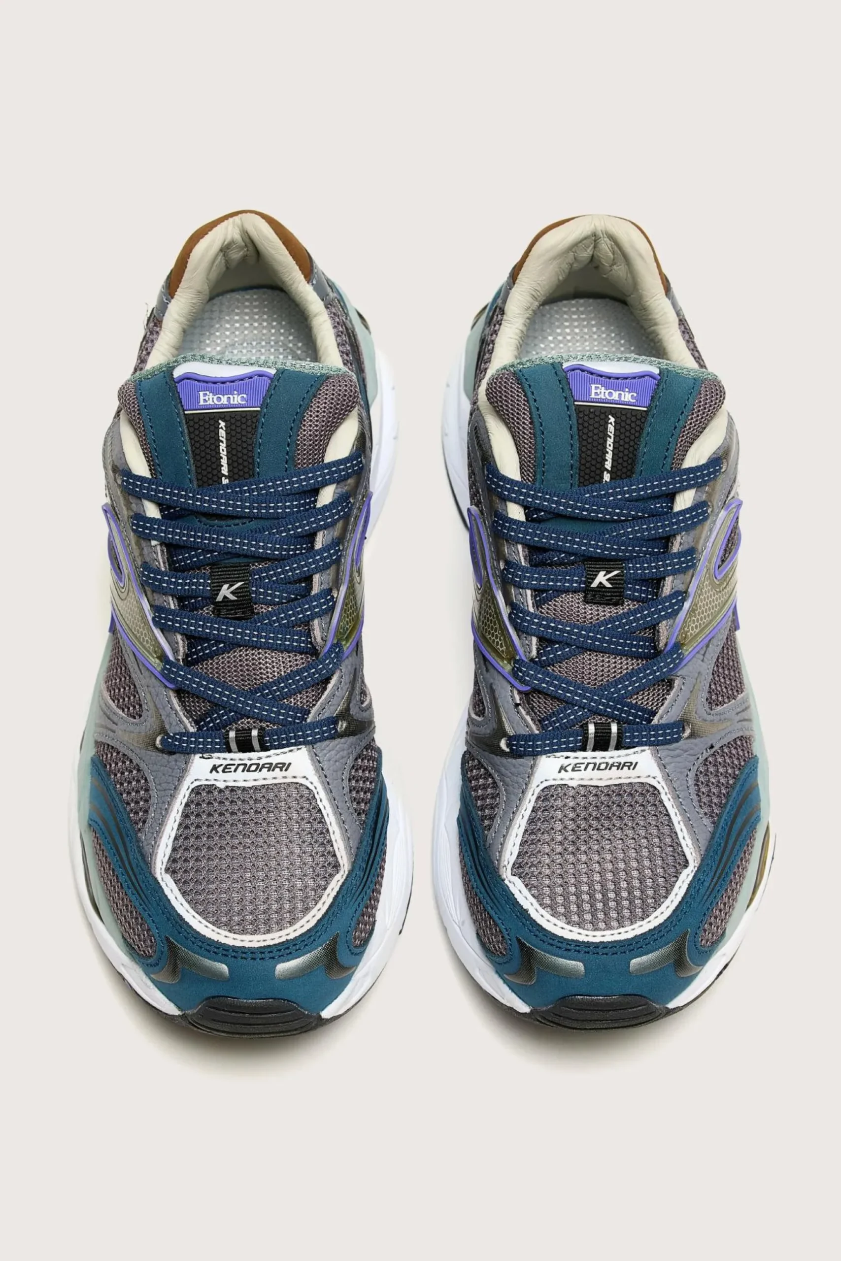 The Etonic Kendari Multi running sneaker features a technical textile and mesh upper with leather panels, tonal laces, and comfort details.