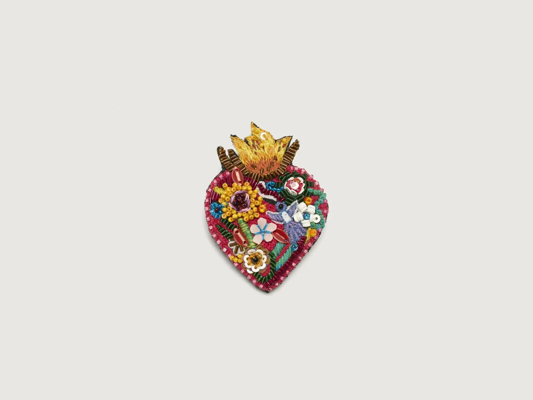 De Trovelore Flaming Heart Broche speld, met de hand geborduurd door Indiase ambachtslieden, is een prachtig draagbaar kunstwerk.